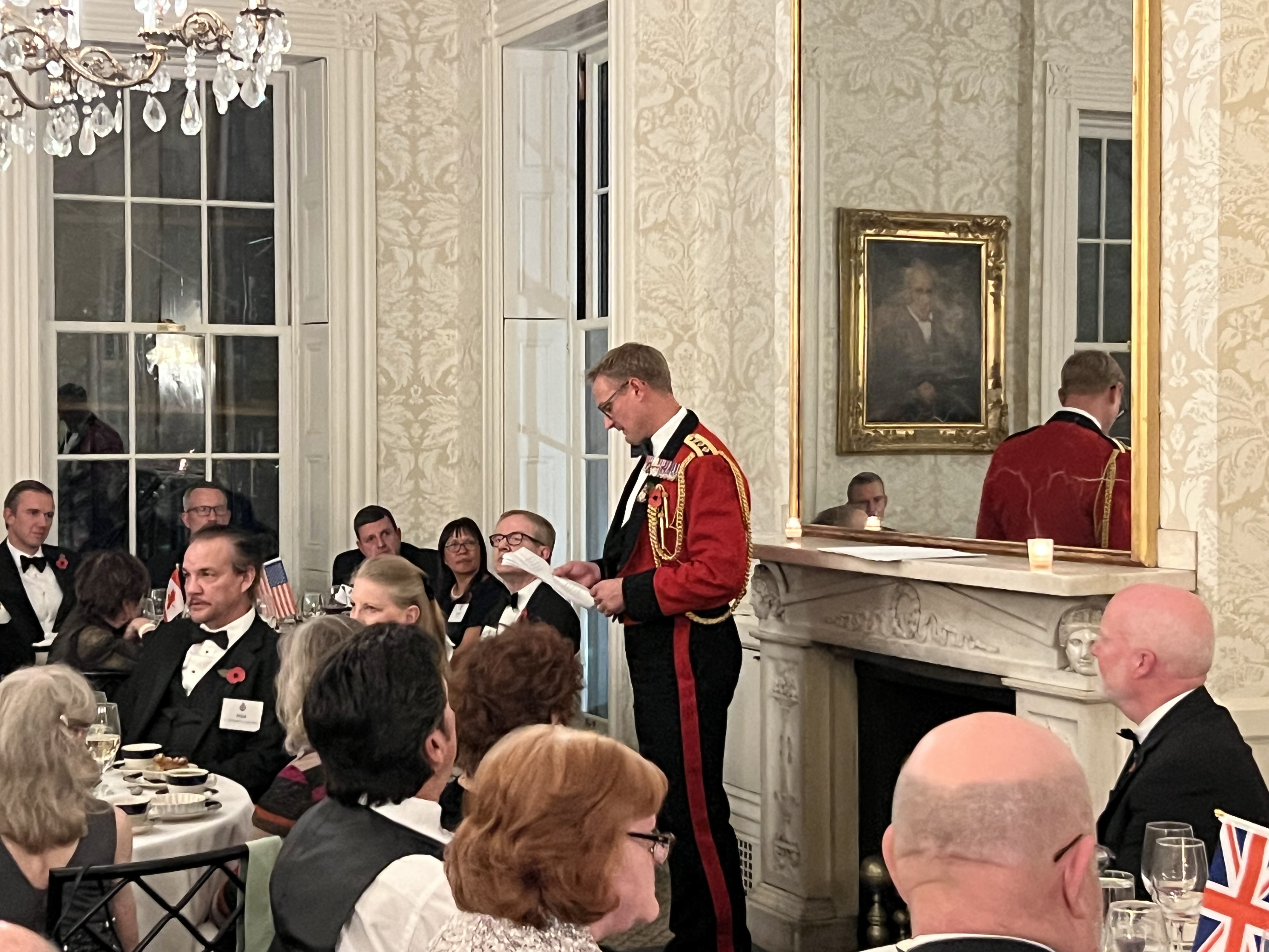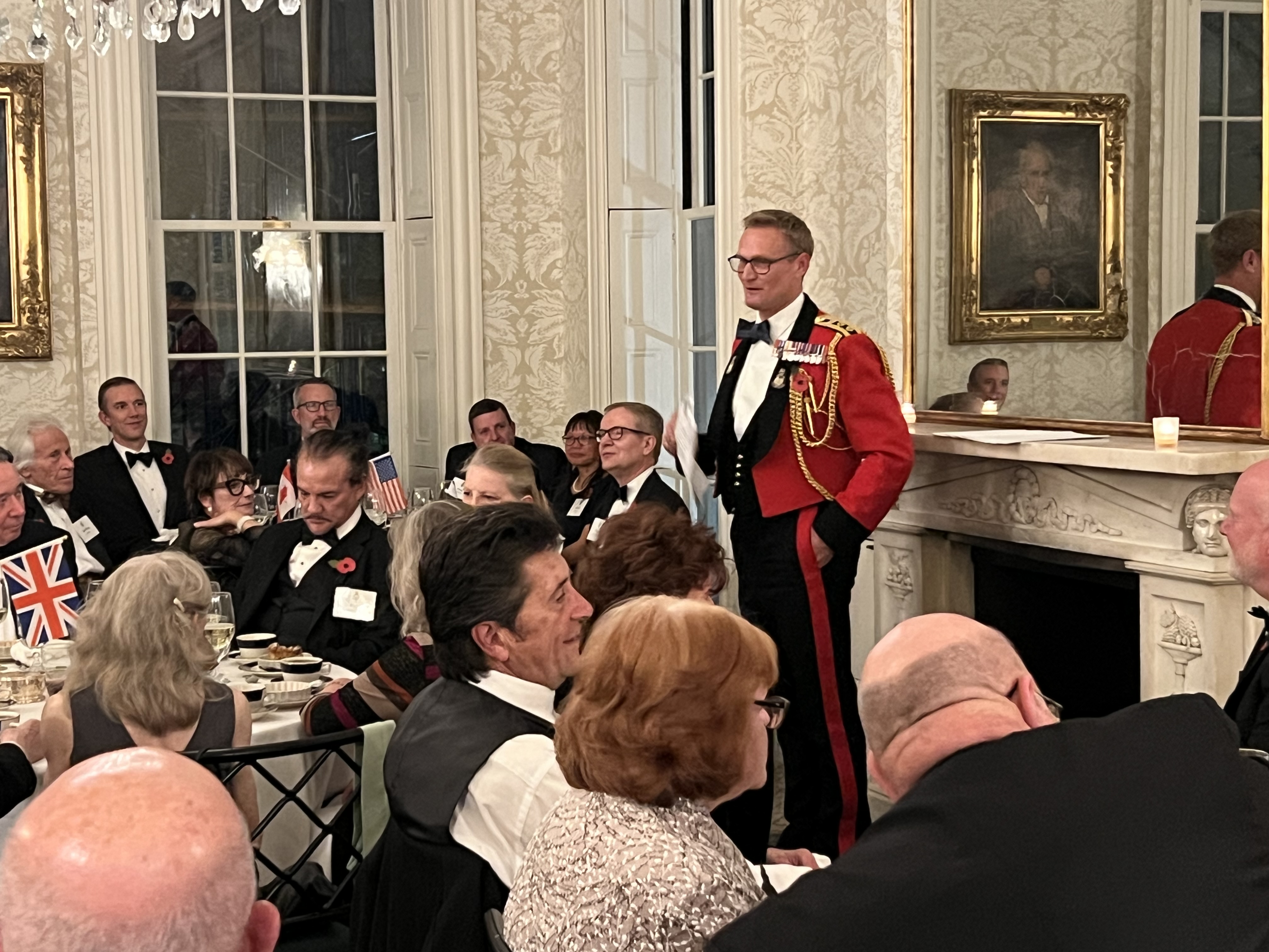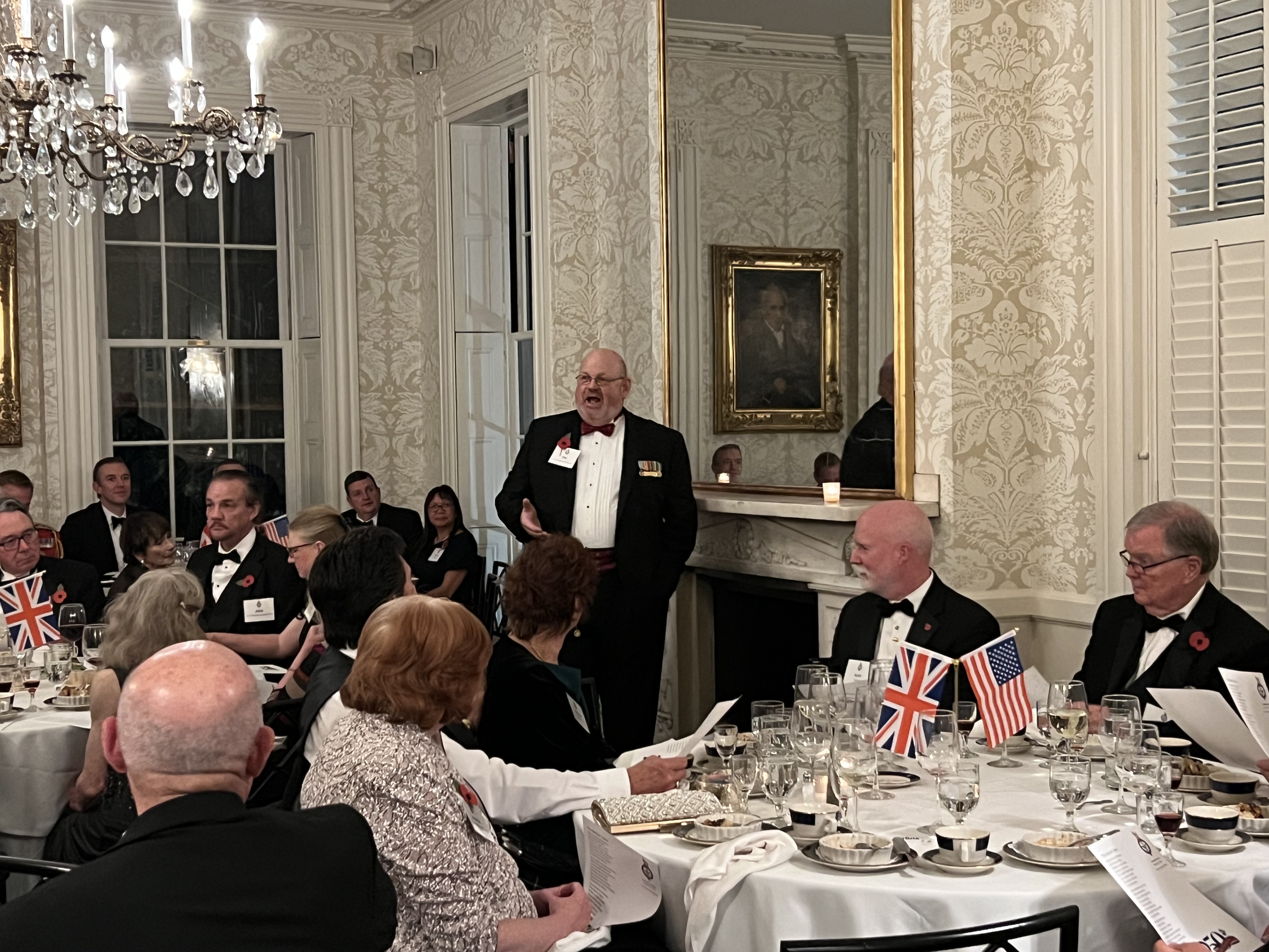 Photos below of Col. Ben Foster RM delivering his after dinner speech and leading the two-minute silence.  At the end of the evening, Lt. Col. Tim Shobbrook USMC led the celebration of the 250th Anniversary of the USMC founding, delivering an overview of the history of the Marine Corps.